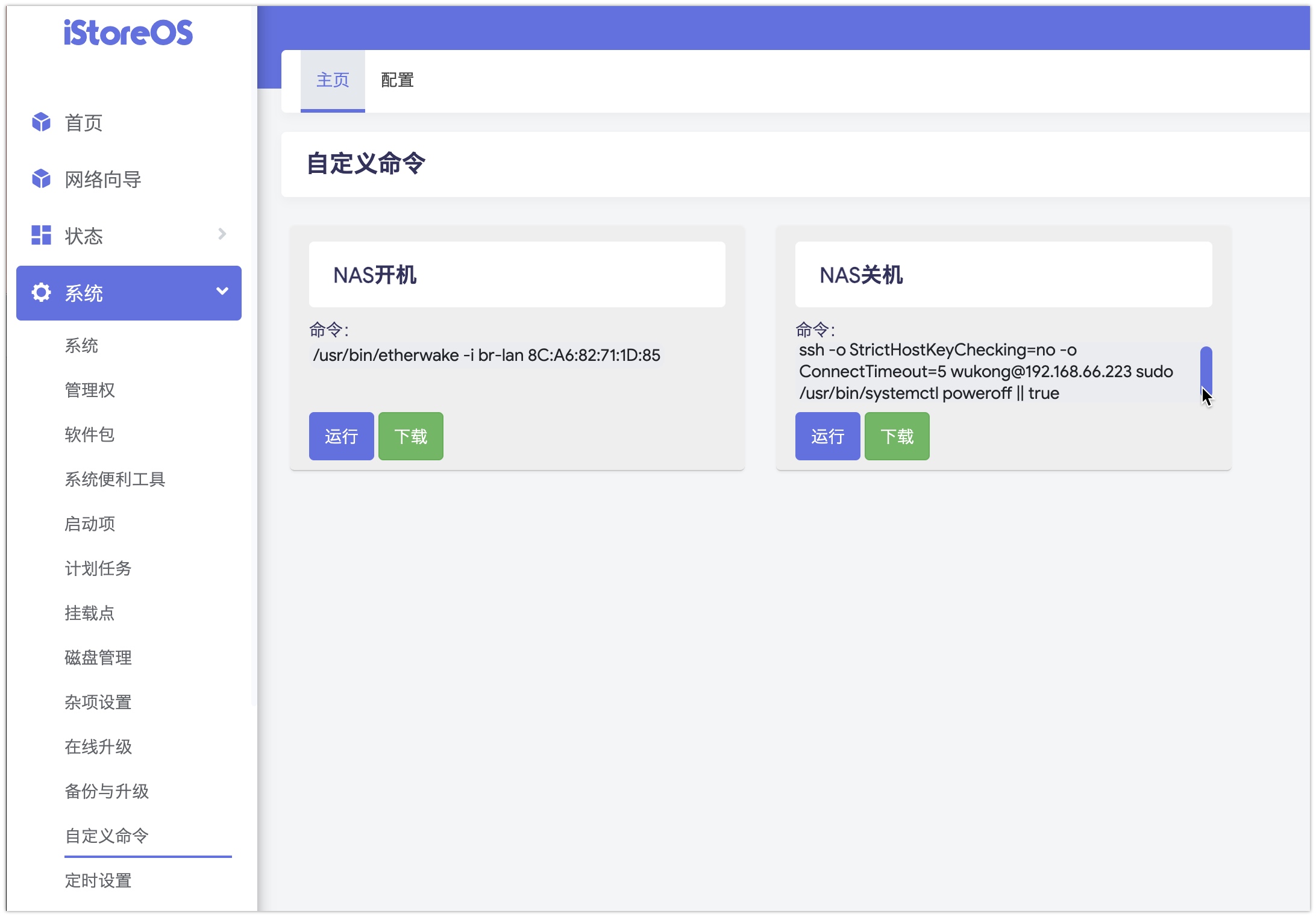 ssh -o StrictHostKeyChecking=no <NAS用户名>@<NAS的IP地址> sudo /usr/bin/systemctl poweroff || true在openwrt上准备好网络唤醒工具
